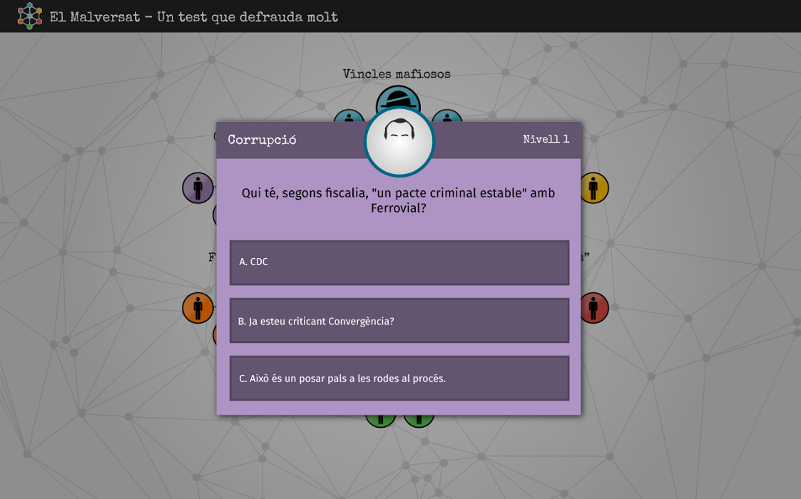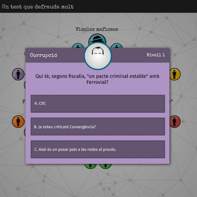 La cita no és gratuïta i coincideix amb el segon aniversari “de la confessió andorrana de Jordi Pujol i els set anys de la de Fèlix Millet en relació al saqueig del Palau”. El test virtual, amb el nom de “El Malversat’, només requerirà un compte a Facebook i consistirà en la resposta a més de 200 preguntes en sis àmbits: corrupció, frau fiscal, els amiguets, impunitat, vincles mafiosos i contra el silenci.
