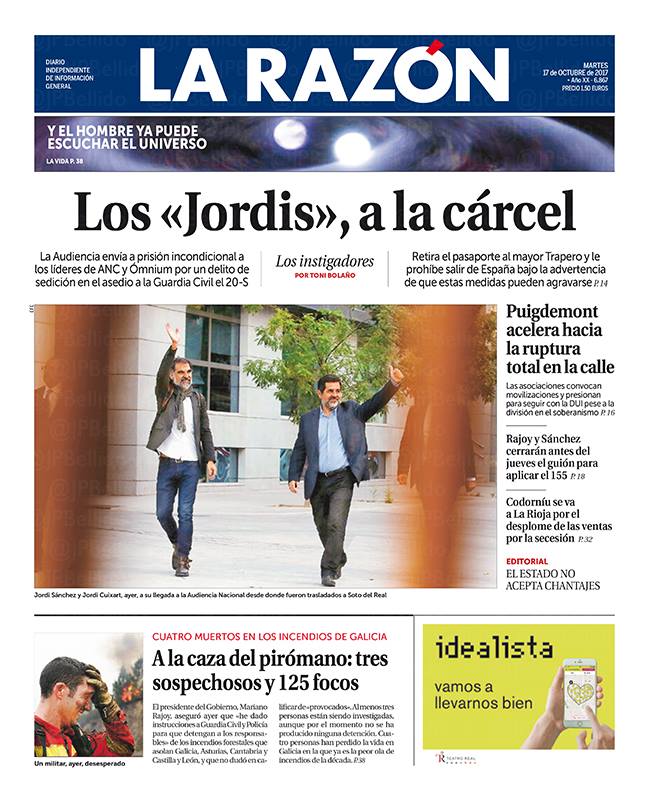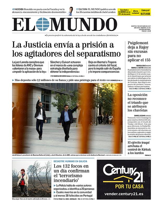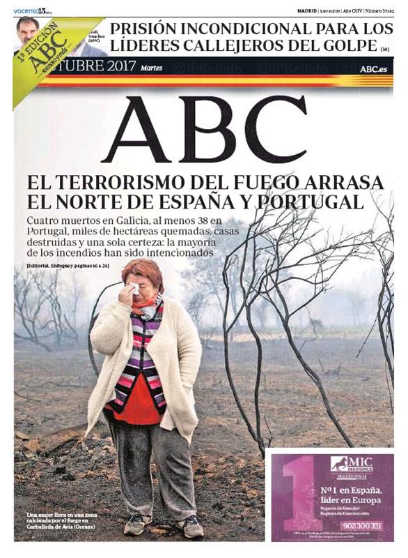 ABC que, avui sí, obre amb els incendis de Galícia, porta a la seva portada un avanttítol que informa sobre la privació de llibertat per als líders sobiranistes, a qui defineix com a "líders de carrer del cop". Però això no és tot. En la seva editorial, titulada "El procés entra a la presó", el rotatiu es mostra convençut que la decisió de la jutgessa de l'Audiència Nacional "és la conseqüència legal inevitable de la seva participació activa en els tumults dels dies 20 i 21 de setembre" i es felicita que "la perseverança del Ministeri Fiscal ha donat els seus fruits".