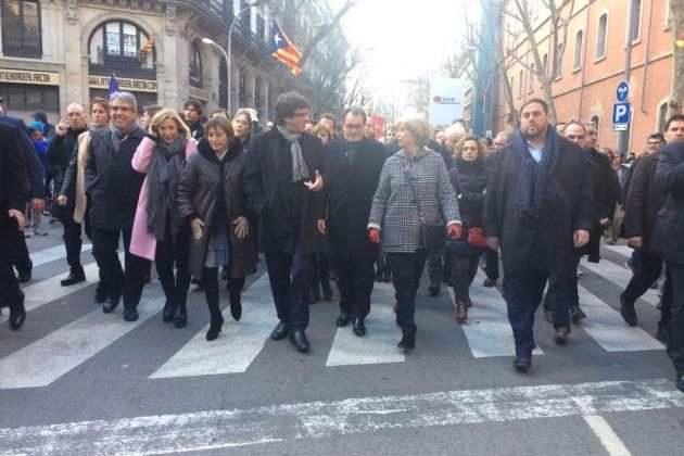 Els tres acusats han estat acompanyats tot el camí pel president del Govern, Carles Puigdemont, que ha començat el camí des del Palau de la Generalitat després de fer la seva declaració institucional on deixava clar que "molts ens sentim jutjats", per la presidenta del Parlament, Carme Forcadell, el vicepresident i conseller d'Economia, Oriol Junqueras, o el portaveu del PDeCAT al Congrés, Francesc Homs, que també està a l'espera que se'l jutgi per la mateixa qüestió.