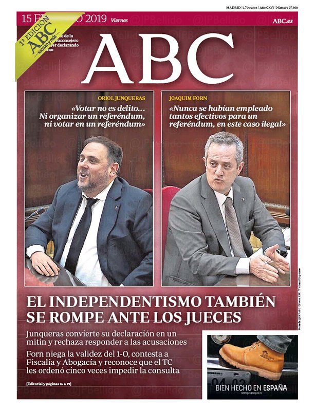 El País, en canvi, potser s’ha adonat que del tercer dia del judici al procés no en trauria gaire petroli i l’ha bandejat a una columna. La resta dels seus col·legues madrilenys no s’hi han conformat i estrafan les declaracions de Junqueras i Forn per oposar-los. Prietas las filas, informen des de la perspectiva de les fabricacions policial-judicials i presenten al conseller desmentint el vicepresident. Tots culpables.