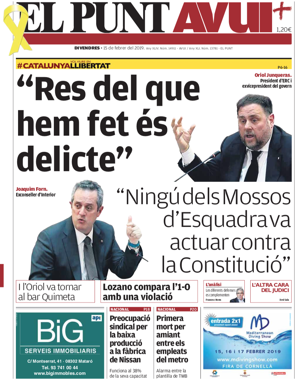 La Vanguardia —la veterania és un grau— s’han empescat una manera de fer el mateix (enfrontar els dos testimonis) sense necessitat de grapejar els fets amb interpretacions malicioses. Un titular al costat de l’altre que es llegeixen com dues frases consecutives. Al lector només li cal afegir una conjunció, copulativa o adversativa, tant li fa, i ja tens enfrontats a Junqueras i Rull. El més llest de la classe. La portada d’El Punt Avui fa el contrast oposat: diu el mateix i s’interpreta en sentit contrari. L’Ara, ídem, però amb un titular principal interpretatiu. Almenys cap d’aquests tres (ni El País) deforma els fets per a encaixar-los en el relat de violència i malversació que et volen fer empassar.