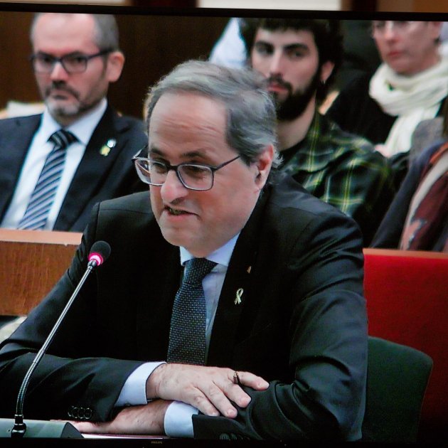 El primer president de la Generalitat en actiu que es veu sotmès a judici, Quim Torra, ho fa sense cap membre del seu govern dins de la sala. Tant els membres de l'executiu com el president del Parlament, Roger Torrent, s'han quedat a les portes del tribunal després d'acompanyar Torra al judici per desobediència per no retirar els llaços grocs del Palau de la Generalitat a la campanya del 28-A. No hi havia espai reservat dins la sala perquè segueixin el judici, atès que, segons s'ha argumentat, és massa petita.