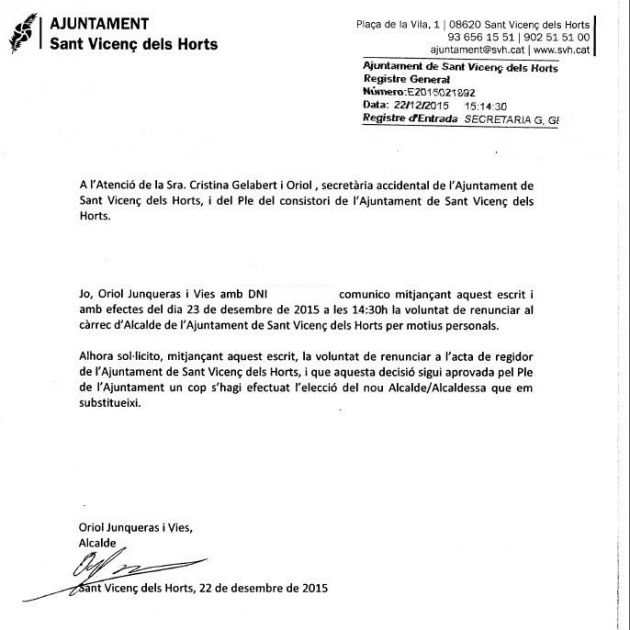 El president d'ERC, Oriol Junqueras, ha comunicat avui a l'equip de govern del consistori de Sant Vicenç dels Horts (Baix Llobregat) que plega com a regidor i alcalde d'aquest municipi, segons ha sabut El Nacional i tal com exposa el polític republicà en la carta adreçada a la secretària de l'Ajuntament: