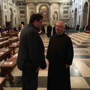 El vicepresident hi havia arribat la nit anterior. Tard. Però amb temps per saludar el conseller d’Exteriors, Raül Romeva, que també era a Roma tot i que la seva visita va ser encara més breu, ja que va haver de retallar agenda i volar directament a Madrid per substituir el vicepresident a la trobada amb el ministre d’Hisenda, Cristóbal Montoro. Un curiós intercanvi de papers dins del Govern. La cúria romana per a Junqueras i el ministre de Jaén per a Romeva.
