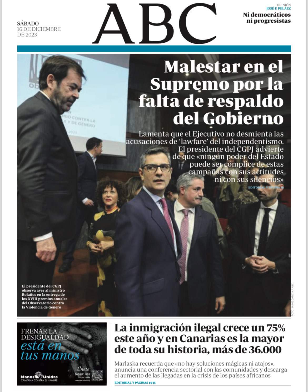 Sí que s’ha vist al ministre Fèlix Bolaños córrer a apaivagar a l’elit dels jutges espanyols, que feien escarafalls d’indignació pomposos i solemnes. Poca cosa més, però: no s’han vist grans manifestacions massives de solidaritat amb ses il·lustríssimes. Al contrari, hi ha grups parlamentaris que volen fer passar als jutges esmentats i d’altres, per les comissions d’investigació sobre la repressió i l’espionatge a l’independentisme. L’emprenyada judicial no deu ser menor i d’aquí ploren les portades que aquest dissabte publiquen El Mundo (“Els jutges avisen al Congrés: no poden ‘ni admetre que els citin’”), l’ABC (“Malestar al Suprem per la manca de suport del govern [espanyol]”) i La Razón (“EL CGPJ clama per les comissions d’investigació i demana que deixin en pau als jutges”).