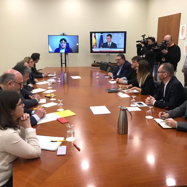Els líders de JxCat i la direcció del PDeCAT s'han reunit aquest divendres al matí al Parlament i han vist conjuntament la compareixença del president Pedro Sánchez on ha convocat eleccions espanyoles el 28 d'abril. Una imatge d'unitat d'aquest espai electoral en la que hi han participat els presidents Carles Puigdemont i Quim Torra a més de la consellera Elsa Artadi i el president i vicepresidenta del PDeCAT, David Bonvehí i Míriam Nogueras.