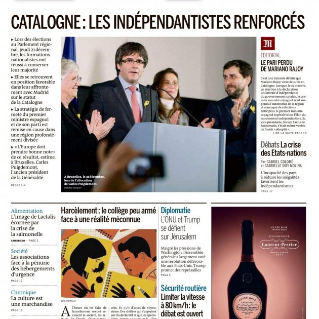 Le Monde analitza que Cs ha quedat primer, i que Albert Rivera "es reafirma cada cop més a nivell espanyol". I apunta que les urnes "imposen" Puigdemont com a president potencial de Catalunya, malgrat les amenaces de detenció, i a més "sense ser hostatge de la CUP". Tot plegat segons el rotatiu francès obliga a fer política, i gairebé ho implora al líder del PP: "Senyor Rajoy, faci política!", exhorta.