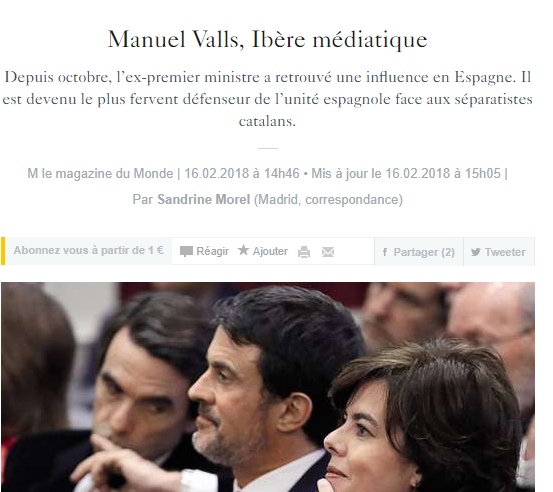 "Des que la crisi catalana va esclatar, el diputat de l'Essonne ha retrobat a l'altre costat del Pirineu una part de la influència que ha perdut a França, o al menys de l'interès mediàtic. Els posicionaments rotunds contra la "sedició" dels independentistes catalans, a favor del respecte a l'Estat de dret i a la Constitució, sobre els perills del nacionalisme o de l'independentisme, en defensa de la "democracia espanyola" l'han fet un dels defensors més fervents de la unitat d'Espanya".