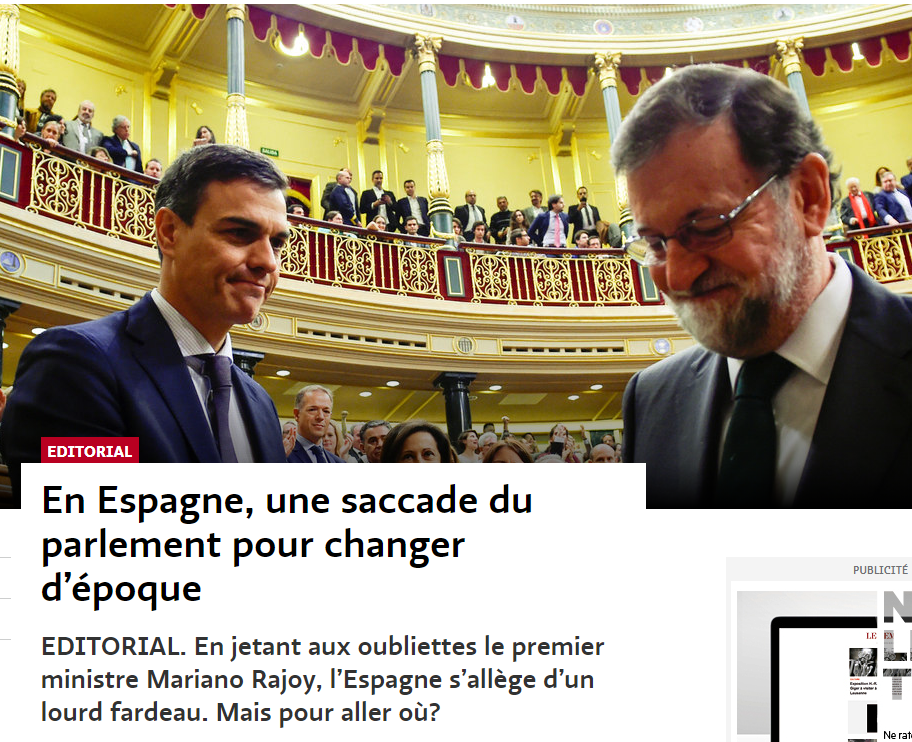Le Temps subratlla que han estat necessaris 22 "partits i micro-partits" per destronar Rajoy, i que aquests porten "un garbuix d'interessos barrejats, a vegades contradictoris, que aviat ofegaran el nou president del govern".