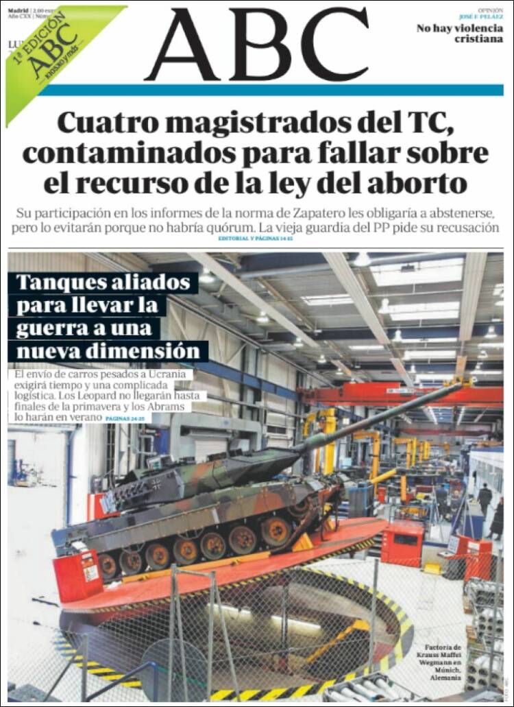 L'ABC opta pel mateix tema per arrencar la setmana i indica que hi ha "quatre magistrats del TC contaminats per fallar sobre el recurs de la llei de l'avortament". La portada d'aquest dilluns afirma que aquests quatre magistrats van participar als informes de la norma del govern del socialista Zapatero i això "els obligaria a abstenir-se", tot i que ho evitaran perquè sinó no hi hauria "quòrum". El diari subratlla que "la vella guàrdia del PP" demana que siguin recusats. La fotografia és en clau internacional i és d'una fàbrica alemanya que fabrica tancs per enviar a la guerra d'Ucraïna. El text de la fotografia avisa que la fabricació i la logística al voltant dels tancs és complicada i que, per tant, els famosos Leopard podrien tardar en arribar al seu destí.