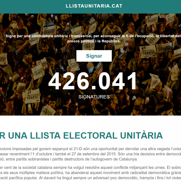 Per una banda, la plataforma Llistaunitària.cat va néixer la setmana passada, amb un manifest que es pot signar a través d'Internet. Va comptar amb el suport del mateix president Puigdemont, i ja suma més de 425.000 signatures. Per altra banda, Respública.cat va veure la llum aquest dimarts, amb la voluntat de recollir signatures per constituir una agrupació d'electors. Entre els impulsors hi ha Eudald Carbonell, Salvador Cardús, Víctor Tarradellas, Francesc Abad o Víctor Cucurull, entre d'altres.