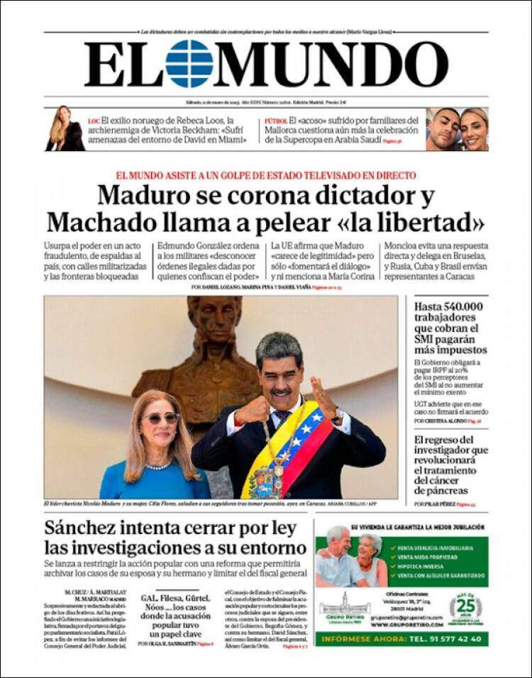 El Mundo també obre la seva portada amb Veneçuela i assegura que el món assisteix a “un cop d’estat televisat en directe”. El titular del rotatiu és: “Maduro es corona dictador i Machado clama a lluitar la ‘llibertat’”. L’ABC dedica la seva gran fotografia de portada a Maduro (que somriu amb un nen en braços que també porta la banda presidencial després de jurar el càrrec), sota el titular “Edmundo desafia a l’usurpador”. La Razón, en canvi, dedica una petita crida a la portada a Veneçuela amb el titular “Maduro, president de Veneçuela per un tercer mandat”, i també dona de manera molt discreta que “Trump evita la pena en el ‘cas Stormy Daniels’ però no l’estigma. En canvi, ni El Mundo ni l’ABC no fan cap referència a la notícia sobre el president electe nord-americà.