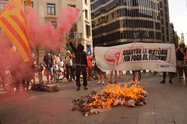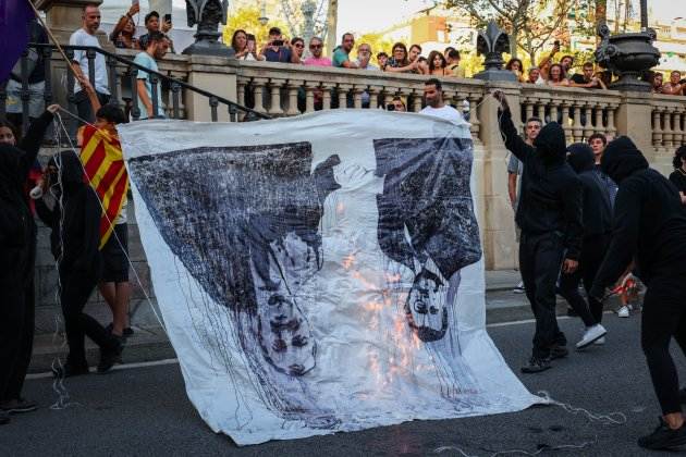 Uns cinc d'encaputxats han cremat aquest dilluns a la tarda una imatge del president de la Generalitat, Pere Aragonès, i l'alcalde de Barcelona, Jaume Collboni, durant la manifestació de l'Esquerra Independentista per la Diada. Cap a les 19.10 h, entre el passeig Lluís Companys i el carrer Comerç, els encaputxats han ruixat la imatge amb alcohol i l'han calat foc.