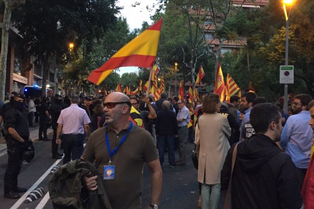 Una concentració de grups d'extrema dreta ha reunit unes 400 persones amb banderes espanyoles i senyeres a les portes de la seu de l'ANC al carrer Marina de Barcelona aquest divendres a la tarda. Els manifestants criden consignes com "No nos engañan Catalunya es España" o "Yo soy español, español". Des d'un megàfon, cridaven "Secesión kaput" i han encès bengales vermelles. La convocatòria ha estat organitzada pel grup neofeixista Democracia Nacional.
