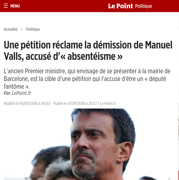 L'exprimer ministre francès Manuel Valls rep de valent avui a la premsa francesa. El setmanari Le Point, una de les publicacions més influents en la política francesa, informa d'una campanya que ha aparegut a París perquè l'exmilitant del PS dimiteixi de diputat a l'Assemblea francesa.