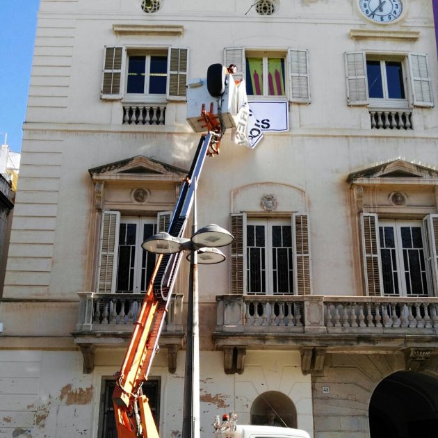 La pancarta, sota el lema "Llibertat presos polítics", l'havien penjat els grups municipals d'ERC i CiU durant el cap de setmana aprofitant els seus finestrals. Els grups han mostrat la seva indignació a les xarxes socials i expliquen que ho van fer per acomplir a un acord del ple municipal i davant la "inoperativitat i nul·la voluntat del govern municipal" de fer-ho.