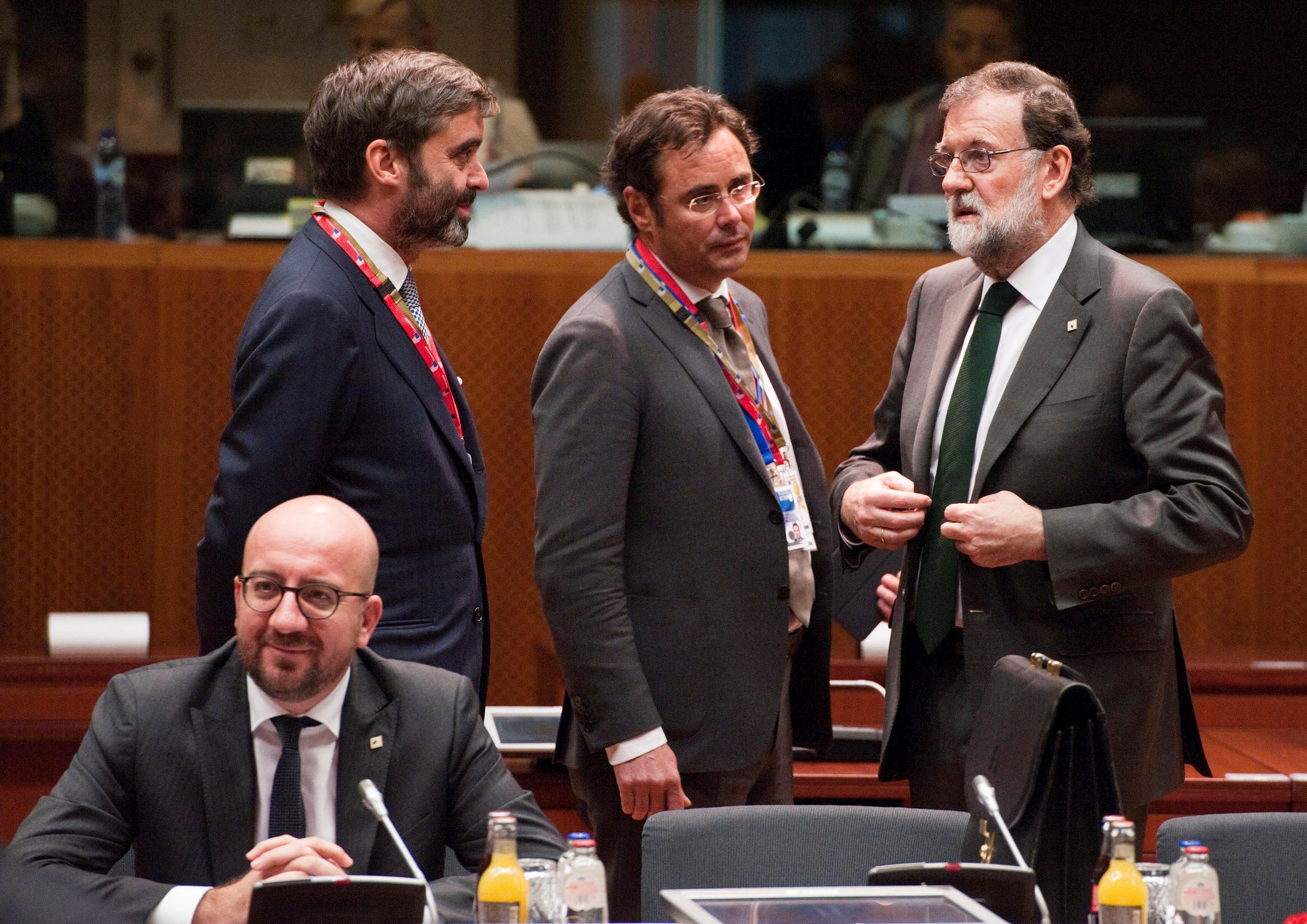 Mariano Rajoy conversa amb el secretari d'Estat per a la UE, Jorge Toledo, i l'ambaixador Pablo García-Berdoy, en presència del primer ministre de Bèlgica, Charles Michel