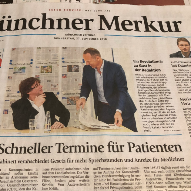 El diari Merkur de Munic ha publicat una fotografia de la visita que el president a l'exili, Carles Puigdemont, ha fet a aquest mitjà i l'ha titulada: "Un revolucionari ens visita".