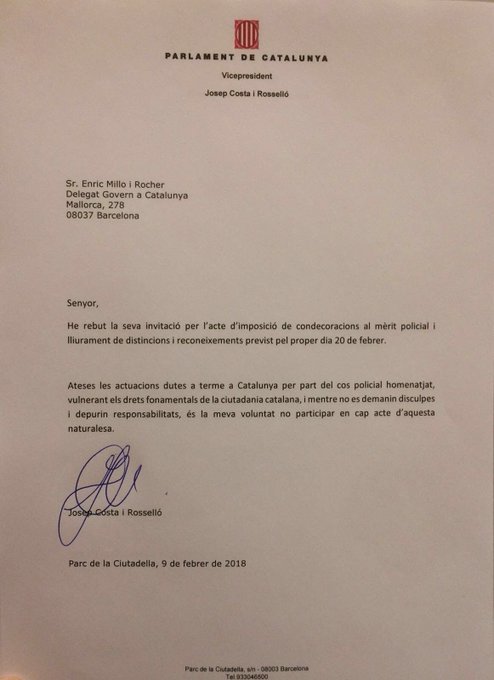 A la invitació, de part del delegat del Govern espanyol, Enric Millo, i del cap superior de la Policia a Catalunya, Sebastián Trapote, anunciaven la "imposició de condecoracions al Mèrit Policial i entrega de Reconeixements". També anava acompanyada d'una carta de Millo, a la qual els diputats han respost per escrit argumentant la seva renúncia.