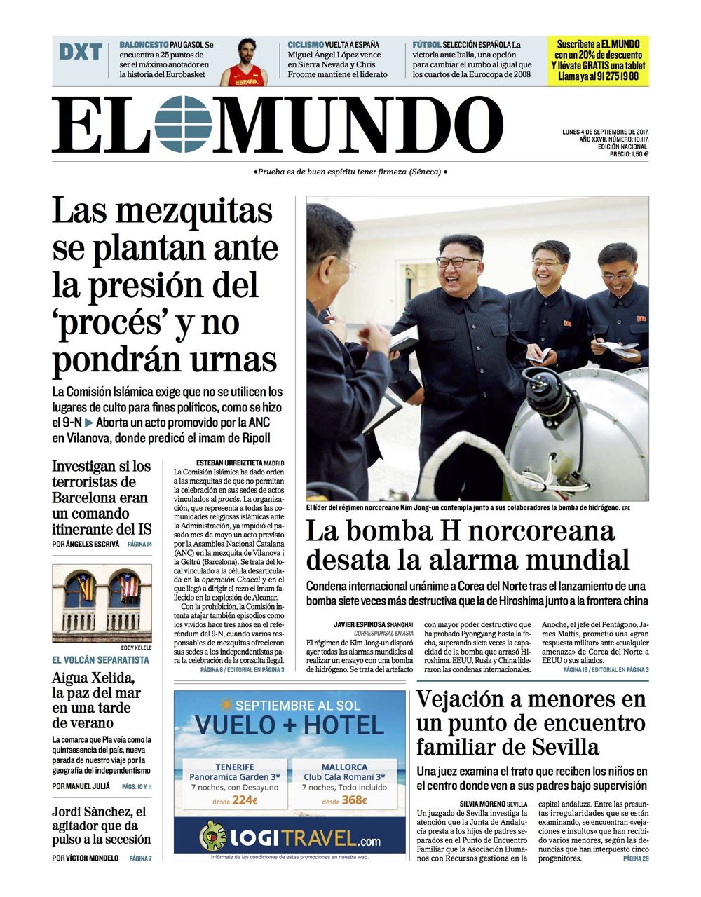"Les mesquites es planten davant la pressió del procés i no posaran urnes". Aquesta és la portada d'El Mundo d'avui, que es fa ressò que la Comissió Islàmica espanyola ha demanat que no s'utilitzi els seus espais de culte amb finalitats polítiques, en aquest cas, per l'1-O.