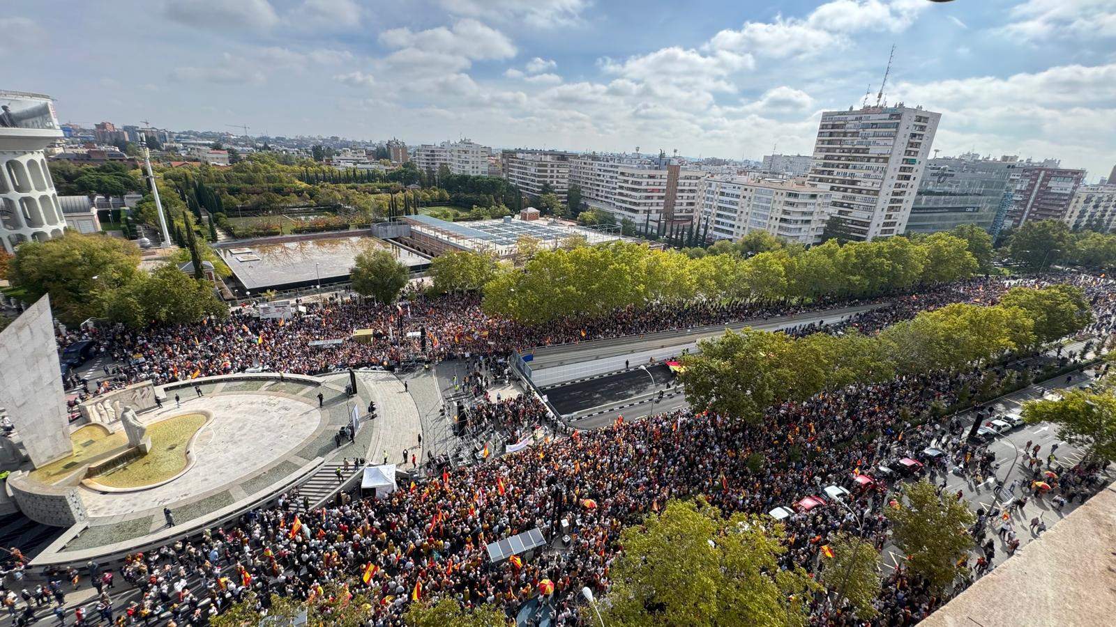 “Avui és el principi del final de la dictadura que ens governa”. Nova protesta al carrer contra Pedro Sánchez. Una concentració convocada a la Plaza Castilla de Madrid, a la qual han assistit Santiago Abascal i dirigents del PP, i promoguda per desenes d’entitats de la societat civil, encapçalades per la Plataforma per a l’Espanya Constitucional, amb un doble objectiu: “Defensar la unitat, la dignitat, la llei i la llibertat” i exigir la convocatòria immediata d’eleccions generals. I amb un missatge clar dirigit a l’espanyolisme radical: “Davant dels Jutjats de Plaza Castilla, demanem que els fiscals honrats que encara queden i els advocats de l’Estat honestos ens ajudin en nom de la llibertat, la justícia i la igualtat a actuar amb contundència per defensar la democràcia i la constitució”. Els convocants, en paraules d’Albert Castillón (periodista) i Marcos de Quinto (exdiputat de Ciutadans), cataloguen el president del govern espanyol de “petit dictador”, “sàtrapa que utilitza la Constitució per al seu benefici”, “enemic comú” i “aprenent de tirà”, i auguren que “no marxarà per la via ordinària ni per les urnes”, sinó que “caldrà fer-lo fora mitjançant la justícia”. Davant d’aquest discurs, una resposta a l’uníson de la gent concentrada: “Pedro Sánchez, a la presó”. La delegació del govern espanyol xifra els assistents en 25.000, mentre que l’organització ho eleva a 400.000 persones.