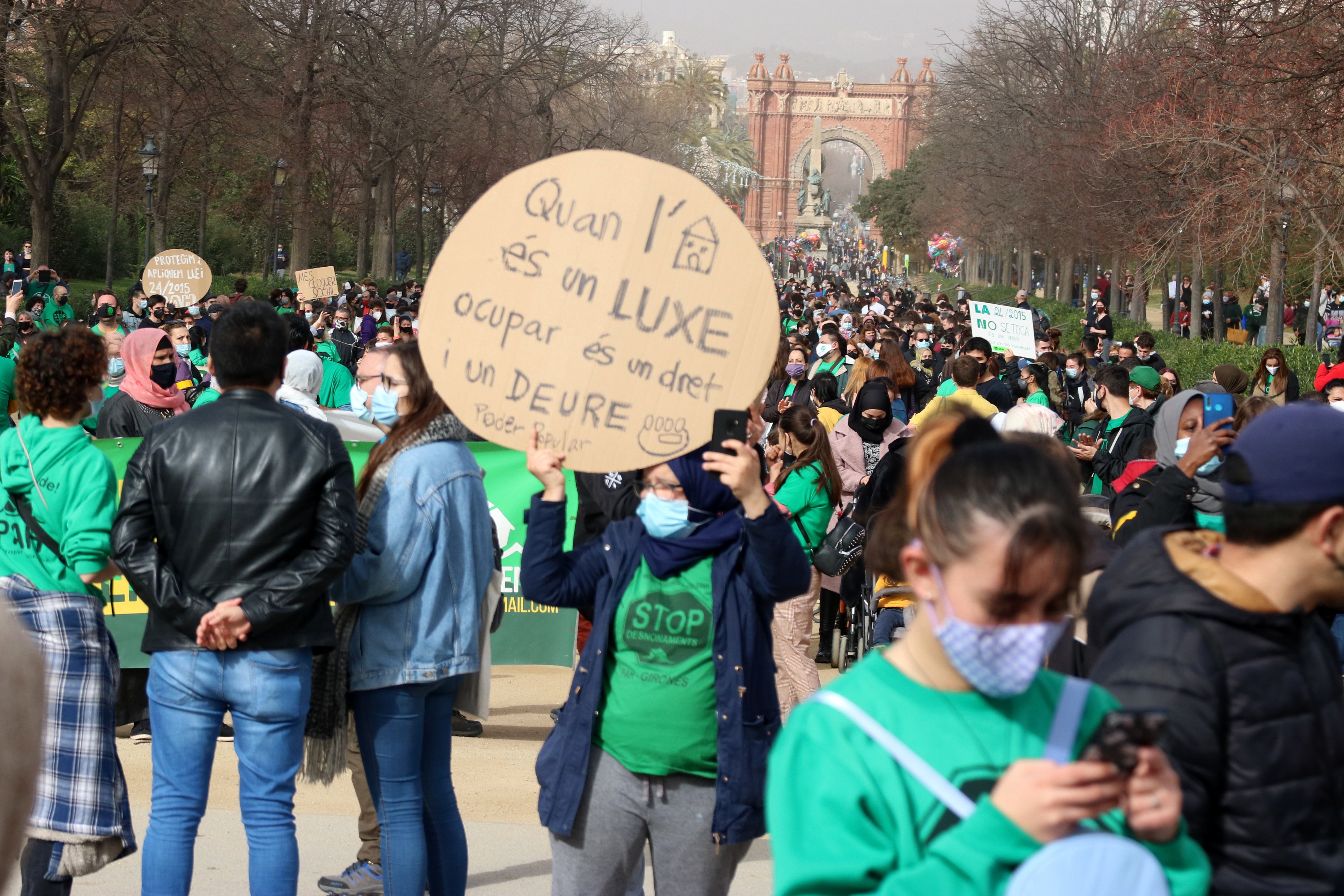 Poc després de les 11 del matí, la manifestació ha començat a caminar passant per davant del Parlament de Catalunya i acabant al centre del parc de la Ciutadella, davant la Glorieta de la transsexual Sònia. Ara fa una setmana, el Tribunal Constitucional va anul·lar el decret llei de mesures urgents per millorar l'accés a l'habitatge impulsat el 2019 pel Govern, que obligava els grans tenidors a oferir lloguer social a les persones vulnerables que ocupin il·legalment un habitatge.
