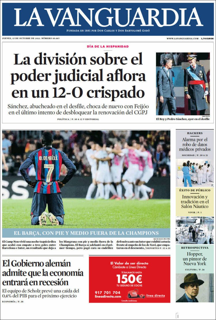 "La divisió sobre el poder judicial aflora en un 12-O crispat", destaca La Vanguardia sobre les paraules de Feijóo que creu que en un termini de sis mesos hi ha temps de sobres d’aprovar la llei per al nou sistema d’elecció de l’òrgan, fet que no comparteix el líder del PSOE. La foto és per al jugador del Barça Ousmane Dembélé. Els blaugrana van empatar aquest dimecres a la nit al Camp Nou contra l'Inter de Milà, fet que els deixa cada cop més a prop de l'eliminació de la Champions.