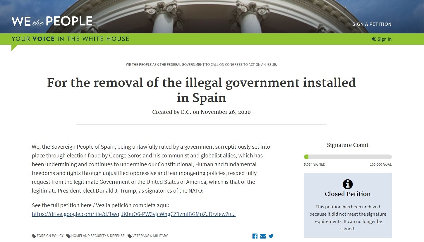 Una de les peticions més recents al govern nord-americà té a veure amb el govern espanyol, segons avança el diari Público. La petició demana que el president sortint, Donald Trump, ordeni a l'exèrcit nord-americà, el US Army, que derroqui "el govern il·legal de Pedro Sánchez" i que, temporalment, "EUA assumeixi el lideratge de l'exèrcit espanyol i dels cossos policials del país".