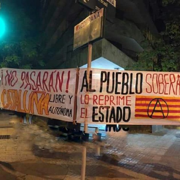 “No passaran! Catalunya lliure i autònoma”, diu una de les dues pancartes. A l’altra s’hi pot llegir que “al poble sobirà el reprimeix l’Estat”, amb la senyera lluint el símbol anarquista al mig: