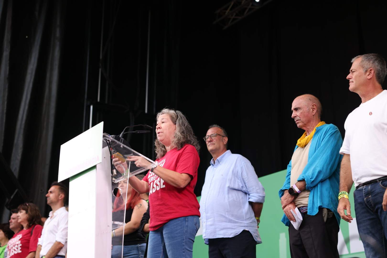 Davant ells, Xavier Antich ha denunciat durant la lectura del manifest, que si bé el moviment independentista els ha facilitat "majories parlamentàries", ells els han malbaratat en "discussions caïnites". Lluís Llach, que ha intervingut com a president de l'Assemblea, ha demanat als milers d'independentistes que omplien el passeig Lluís Companys que es deixessin de "llepar les ferides": "Que cadascú de nosaltres treballi en aquest projecte col·lectiu que és la llibertat del nostre país!".