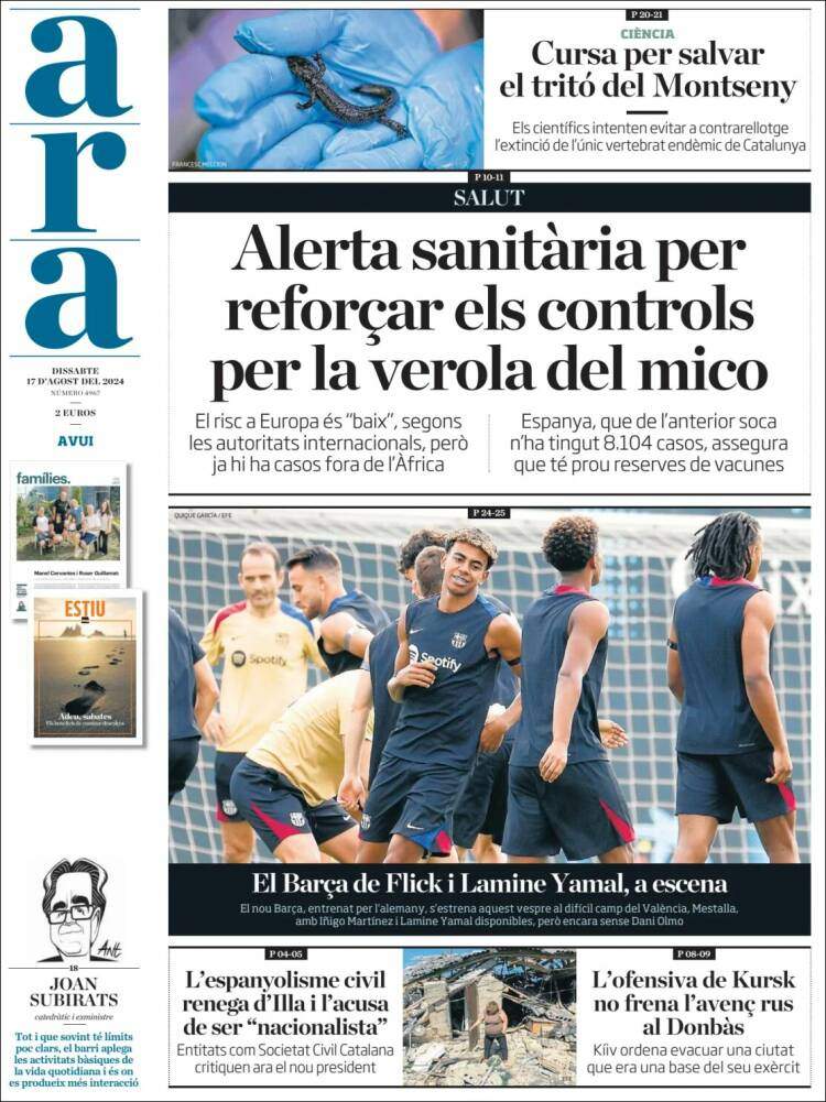 Però si els atemptats del 17A no apareixen a les portades dels diaris catalans, excepte la de El Periódico, a què dediquen les seves pàgines nobles? Doncs La Vanguardia i El País aposten pel mateix tema, la immigració. El rotatiu dels Godó analitza la crisi migratòria i titula amb “la immigració irregular creix un 66% per l’arribada massiva a les Canàries”, mentre que el rotatiu de Prisa també informa que “les entrades irregulars de migrants creixen un 66%, i que Espanya, darrere de Grècia, és el país mediterrani on més augmenten les arribades, que les sortides des de Mauritània es disparen i que els malians són ja la nacionalitat més nombrosa. L’Ara, per la seva part, dedica la seva portada a l’alerta sanitària per reforçar els controls per la verola del mico, tot i que el risc a Europa és baix, i també ha escollit com a tema per la seva foto de portada el Barça de Flick i Lamine Yamal, que aquesta nit farà la seva estrena oficial de la temporada en el debut de la Lliga a Mestalla contra el València.