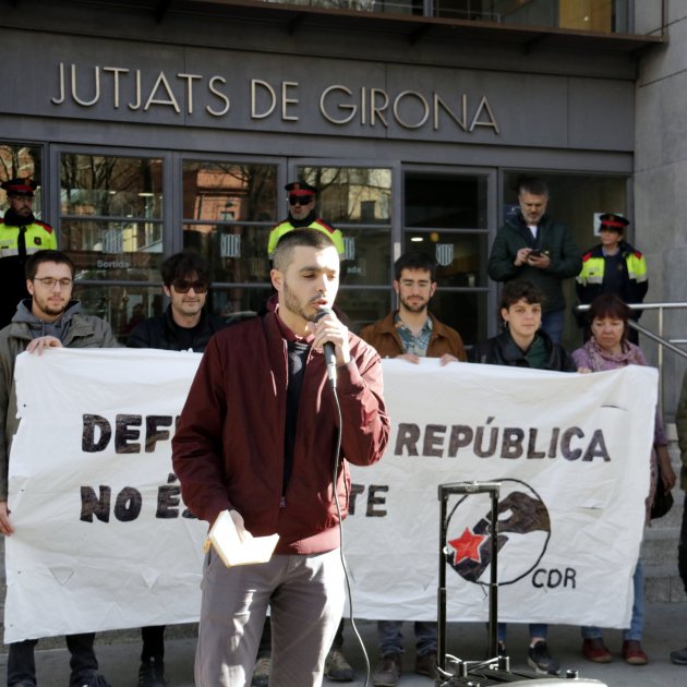 A les portes dels jutjats s'hi ha concentrat una trentena de persones per donar suport a l'investigat. Els activistes també han col·locat a l'entrada de l'edifici una bandera espanyola mig cremada i una placa d'unes dependències de la subdelegació del govern espanyol.