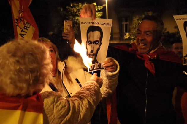Un total de 350 persones, segons xifres de la Guàrdia Urbana, han protestat aquest dijous al vespre davant la seu del govern espanyol a Barcelona contra l'amnistia i els pactes per la investidura de Pedro Sánchez. A l'inici de la concentració, alguns dels manifestants han cremat imatges de Pedro Sánchez acompanyades del missatge de 'traïdor' i l'han acusat de "vendre Espanya". Durant més d'una hora s'han sentit proclames contra Sánchez com ara "no és un president, és un delinqüent" i també contra Carles Puigdemont com "Puigdemont, a presó".