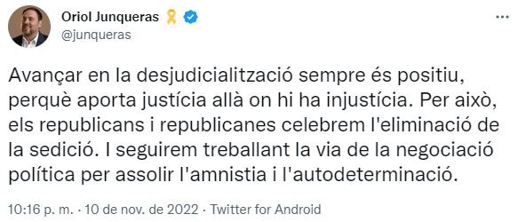 En aquesta línia s'ha expressat també el president d'ERC, Oriol Junqueras, que ha defensat que "avançar en la desjudicialització sempre és positiu perquè aporta justícia allà on hi ha injustícia". "Per això, els republicans i republicanes celebrem l'eliminació de la sedició. I seguirem treballant la via de la negociació política per assolir l'amnistia i l'autodeterminació", ha conclòs en una piulada.