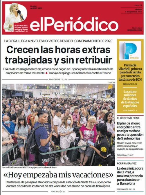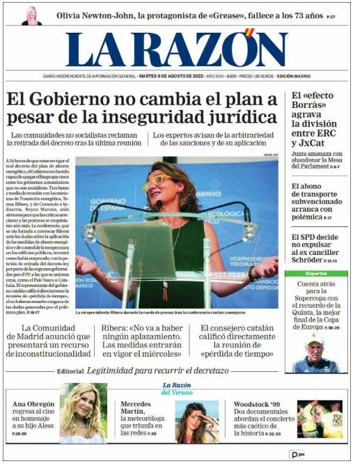 El Mundo posa el focus també en la reunió de la ministra Teresa Ribera amb les comunitats: "Moncloa asume que las CCAA no multarán por incumplir el ahorro". La Vanguardia: "L'Executiu no cedeix davant el PP i s'aferra al pla d'estalvi energètic". Completa la notícia principal amb la foto amb el titular 'Un robatori de cable paralitza l'AVE i provoca el caos'. 'Crecen las horas extras trabajadas y sin retribuir' és l'aposta d'El Periódico, acompanyada de la crisi generada pel col·lapse a l'Alta Velocitat. Ressalta també en portada el fracàs de la reunió d'aquest dilluns i la mort de Newton-John.