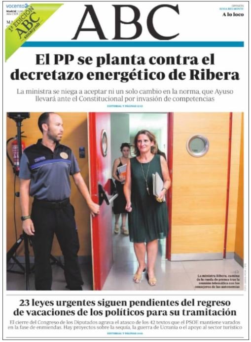 ABC: "El PP se planta contra el decretazo energético de Ribera". La primera pàgina inclou també la notícia "23 leyes urgentes siguen pendientes del regresso de vacaciones de los políticos para su tramitación".