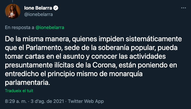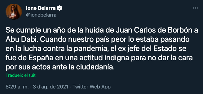 En un fil al seu compte de Twitter, Ione Belarra ha volgut recordar l'"efemèride": "Quan el nostre país pitjor ho estava passant en la lluita contra la pandèmia, l'excap de l'Estat se'n va anar d'Espanya en una actitud indigna per a no donar la cara pels seus actes davant la ciutadania". I assenyala que, durant l'últim any, s'han multiplicat els escàndols amb "revelacions sobre nous comptes ocults en paradisos fiscals, fortunes de dubtós origen, possibles vincles amb el tràfic d'armes... escàndol rere escàndol de corrupció i impunitat".