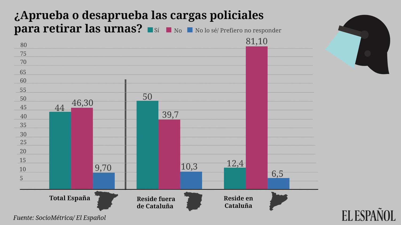 Un 50% dels espanyols -sense comptar els catalans- estan d’acord amb la violència que la Policia espanyola i la Guàrdia Civil van exercir pel referèndum. El 39,7% hi estan en contra, mentre que un 10,3% no ho saben.
