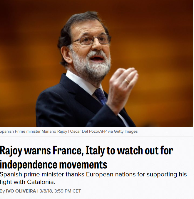El diari Politico descriu avui com el president espanyol, Mariano Rajoy, ha aprofitat la reunió del Partit Popular Europeu (PPE) per fer por amb l'efecte dòmino que podria tenir la independència de Catalunya, per a d'altres punts d'Europa. Rajoy ha advertit durant la reunió a França i Itàlia que "vigilin els seus moviments independentistes".