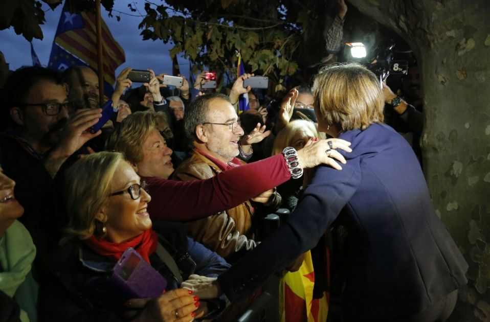 Forcadell, que s'ha apropat a saludar els concentrats, ha rebut múltiples mostres de suport. Després d'un primer intent de saludar els concentrats, ha tornat a la filera amb els diputats i membres de la societat civil i han cantat Els Segadors.