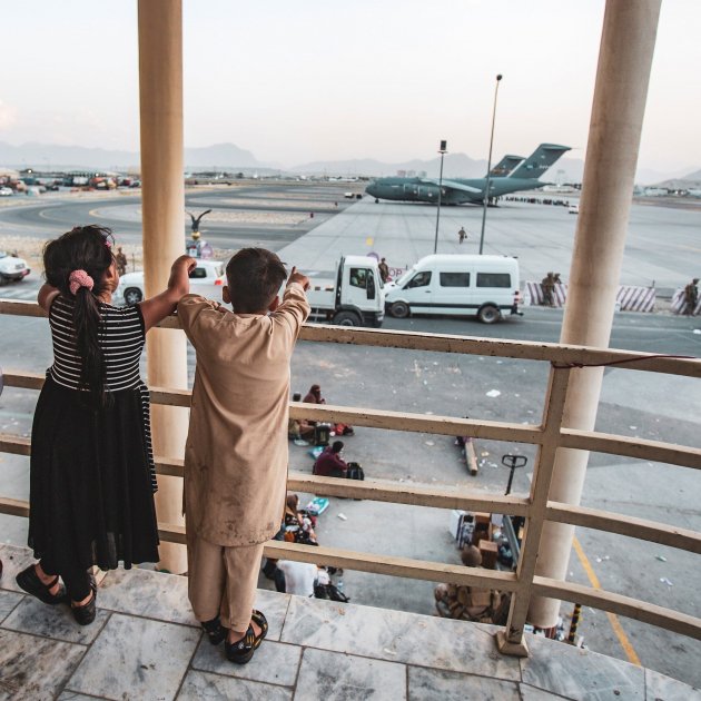 Imatge superior: Dos nens miren un avió a l'aeroport de Kabul / Efe
