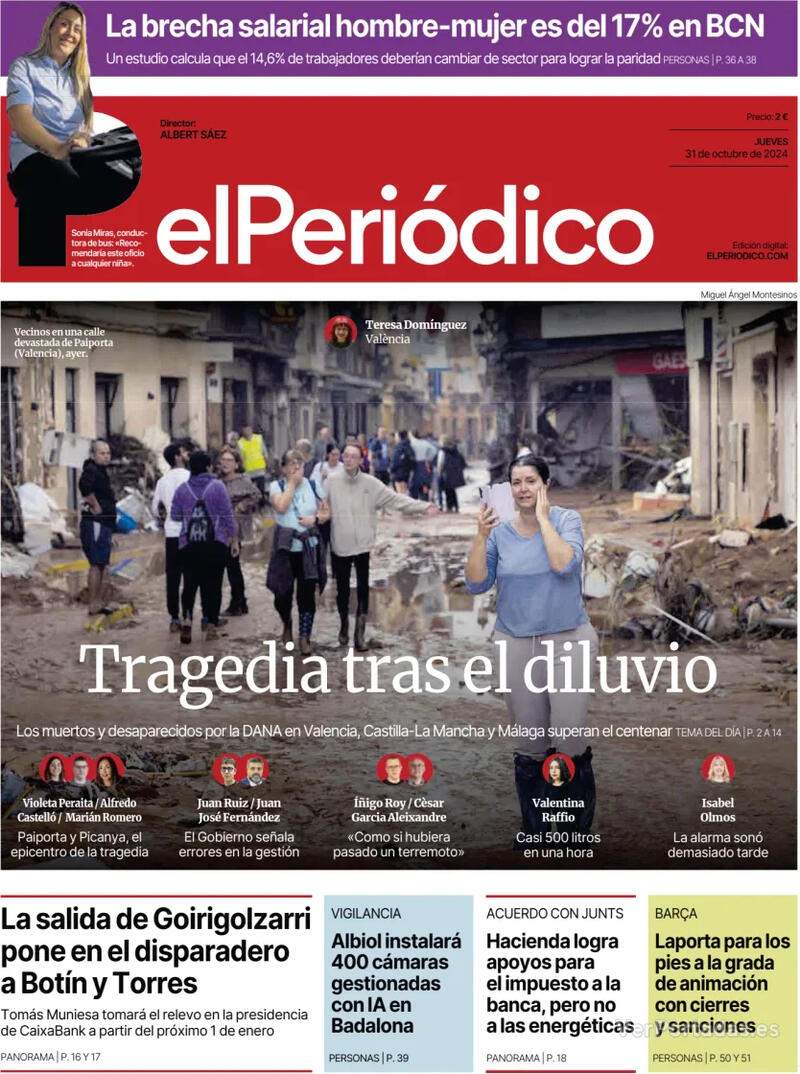 Una imatge que sembla treta d'una pel·lícula apocalíptica: desenes de cotxes amuntegats els uns damunt dels altres i gent caminant-hi pel damunt perquè és l'única manera de travessar el carrer. Aquesta fotografia, present a gairebé totes les portades d'aquest dijous, és el resultat d'una DANA que ha assolat el País Valencià, Castella-la Manxa i Andalusia. Els aiguats han causat, almenys, 95 morts i destrosses tan grans com les que es veuen a les portades dels diaris d'aquest dijous, que en la seva majoria són de les localitats de Sedaví i Picanya. La premsa, doncs, està de dol, però també hi ha espai (només en alguns mitjans, n'hi ha que fan com qui no hi veu) per als retrets, i merescuts, al president del País Valencià, el popular Carlos Mazón. El Mundo es demana per què si l'alerta sobre la crescuda de les lleres es va decretar a les 17.30 h de dimarts, els ciutadans no en an ser informats de manera general fins tres hores després?. I el mateix fa El País, que apunta que la Generalitat no va enviar l'alerta fins vuit hores després que la pluja desbordés els barrancs. Mazón s'excusa i aquest dimecres a última hora afirmava que el sistema d'alertes davant el temporal de la DANA està "protocol·litzat i estandarditzat" i sostenia que està "coordinat per la Direcció General de Protecció Civil del Govern d'Espanya". D'aquesta manera, el dirigent popular s'espolsava la responsabilitat i, fins i tot, apuntava al govern espanyol: "És un protocol prèviament establert i que, a més, coordina la Direcció General de Protecció Civil del govern d'Espanya". Ja se sap, que això de fer autocrítica, entre els polítics, no està ben vist, ni tan sols en situacions tan dramàtiques com les que viu el País Valencià.