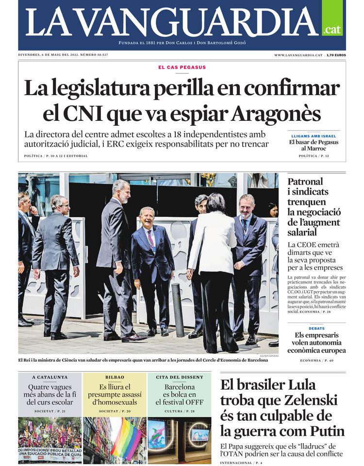 L’efecte que fan les portades d’avui és que contenen la respiració a l’espera de quin és el següent graó que davallarà la democràcia espanyola —el que en queda— en el fangar del CatalanGate. Que la directora del Centro Nacional de Inteligencia (CNI) reconegui que va demanar i obtenir l’aval del Tribunal Suprem perquè els seus espies accedissin sense cap restricció als telèfons mòbils de 18 personalitats independentistes, inclòs el President de la Generalitat, Pere Aragonès, com una potencial “amenaça a l’Estat”, sense que el govern espanyol ho sabés —això diu la Moncloa— és d’una gravetat i té unes conseqüències que queden mal acotades en els títols freds i administratius com són els de l’Ara o el d’El País, on només el verb —“admet”, un equivalent a “confessa”— afegeix una ombra negativa al fet. La sensació és que fan curt, que hi passen de puntetes, amb un deix d’incredulitat o de sorpresa, com si no acabessin de creure-s’ho, de pair-ho, o es refusessin a reconèixer una actuació indisculpable.