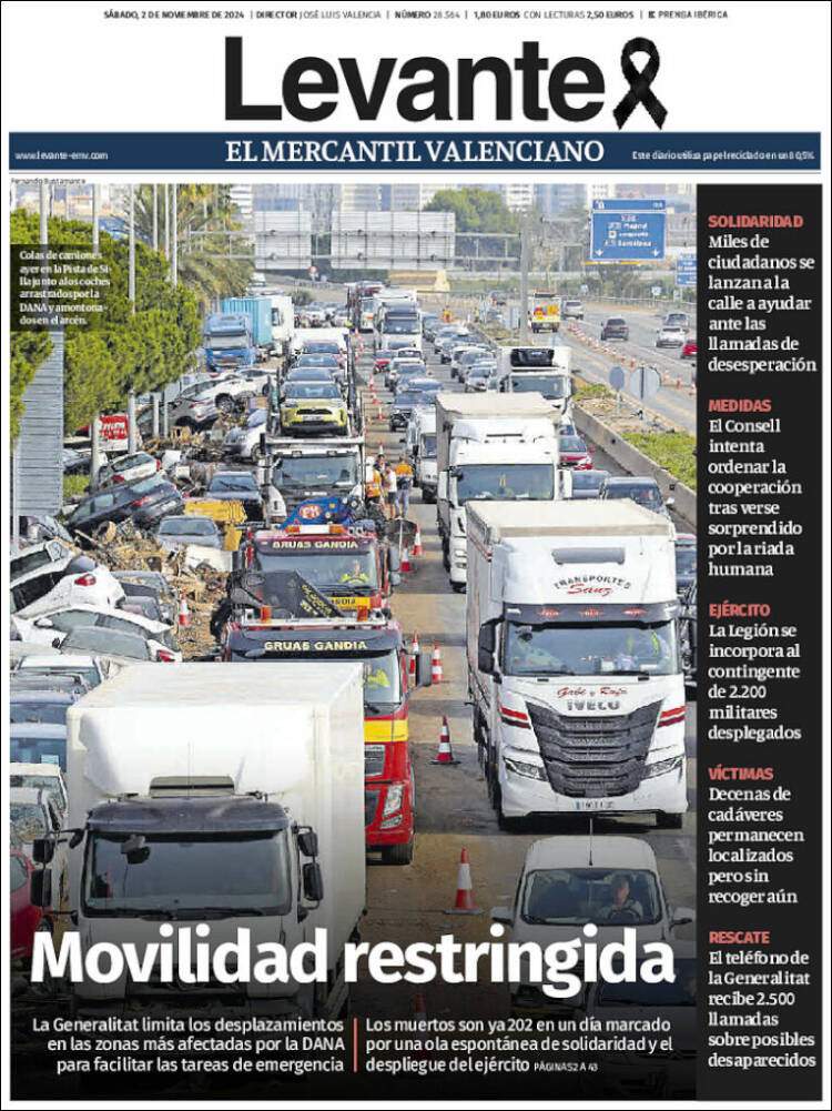 El Levante aposta precisament per aquesta decisió de limitar els desplaçaments en les zones més afectades per la DANA que va decidir ahir a la nit la Generalitat Valenciana. “Mobilitat restringida”, titula, destacant també que els morts eren ja 202 a l’hora del tancament de l’edició d’un dia marcat per una “onada espontània de solidaritat i el desplegament de l’exèrcit”. Las Provincias té un títol potent: “Solidaritat, ràbia, impotència”, i destaca el seu editorial: “Societat mobilitzada, Administració bloquejada”. Els diaris de Castelló, Mediterráneo, i d’Alacant, la Información, han escollit la mateixa fotografia per il·lustrar les seves portades, la d’uns voluntaris retirant fang en un carrer de Xiva, un dels municipis més afectats, i també es fan ressò de la restricció del tràfic als accessos de les poblacions més afectades.