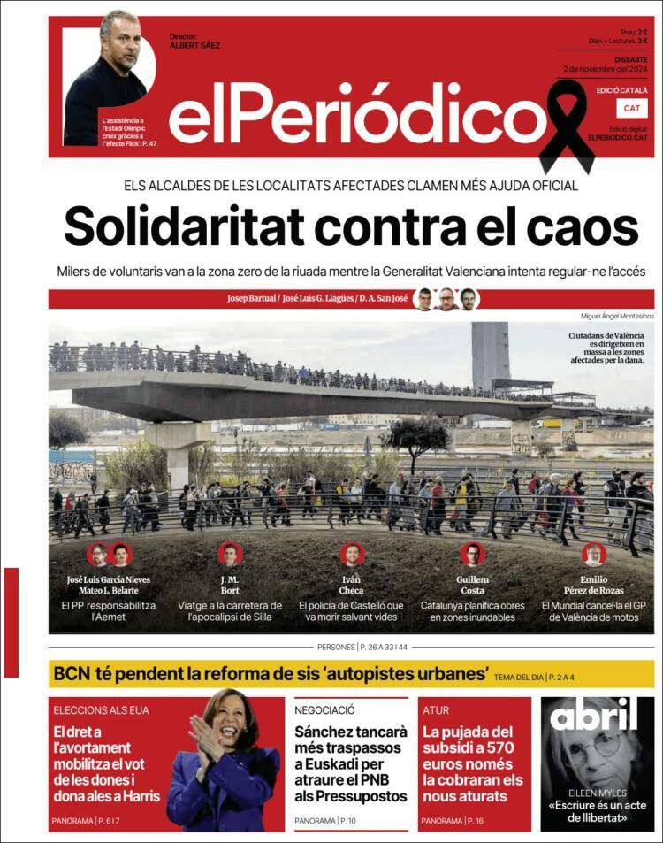 Els diaris de premsa escrita que s’editen a Catalunya també parlen sobre “solidaritat i indignació”, com titula La Vanguardia, que acompanya la seva portada amb una gran imatge dels veïns i voluntaris netejant amb pales i escombres un carrer enfangat d’Utiel; El Periódico també destaca la “solidaritat contra el caos”, amb la fotografia dels ponts que travessen el riu amb una gentada de voluntaris que van cap a la zona del desastre per ajudar, el mateix que fa el diari Ara, que també recull una entrevista de Manel Pardo, exdirector de Protecció Civil, que afirma que “és evident que el govern valencià va enviar l’alerta quan ja sabia que hi havia morts”. I per últim, El Punt Avui, que sempre aposta pels seus temes propis passi el que passi al món, també aquest dissabte dedica tota la seva portada “l’angoixa pels desapareguts” i la gran fotografia dels voluntaris netejant els carrers plens de fang.