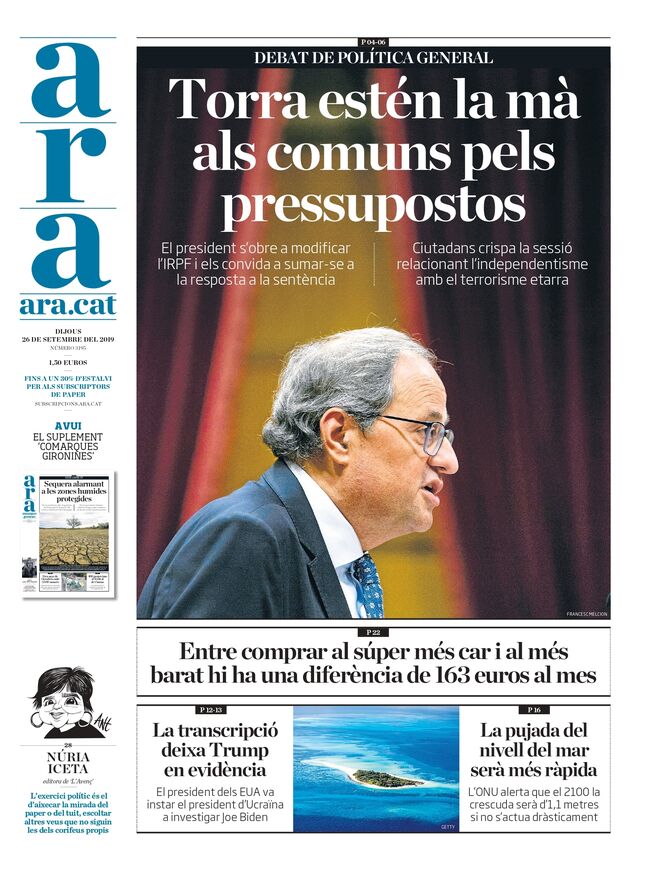 Una cosa és El Punt Avui i l’Ara, que trien el tema que els hi sembla més important, uns el rebuig determinat del president a que s’empastifi l’independentisme amb insinuacions de terrorisme, i els altres que Torra busca d’aliats als comuns per a aprovar els pressupostos. Altra cosa molt diferent és que mentre La Vanguardia, al subtítol, diu que Torra “marca una nova etapa per a l’independentisme”, El Periódico ho nega, perquè Torra “s’encastella en la via del pols amb l’Estat”. En què quedem?