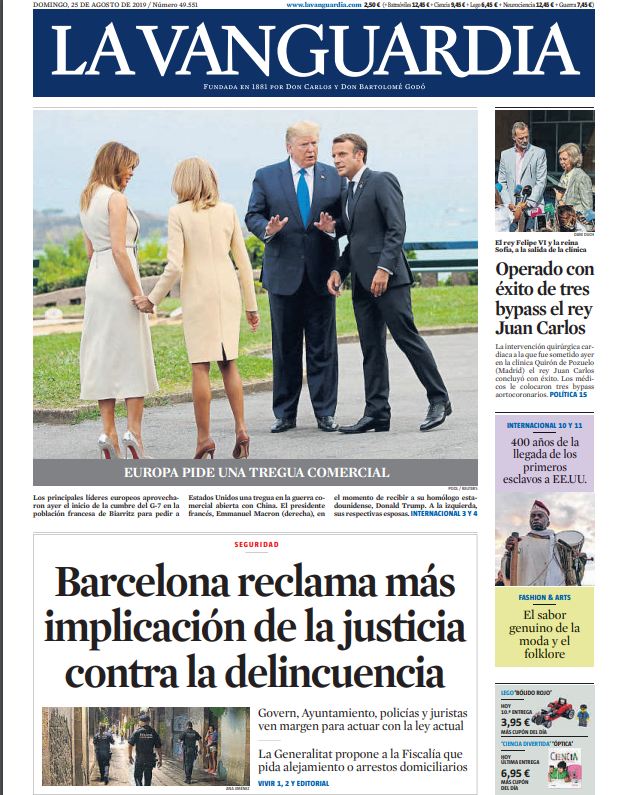 La resta d’afers del dia era tot cosa inaugural o a mig coure. La reunió del G-7 a Biarritz s’ha arrencat amb Macron fent de psicòleg de Trump perquè no esguerri la trobada dels poderosos. A la tele es veia al president francès ben eixerit, mentre que el nord-americà feia posat de què coi hi faig, aquí. Ja veurem què en surt. Dels refugiats de l’Open Arms i l’Ocean Viking no se’n canta ni gall ni gallina.