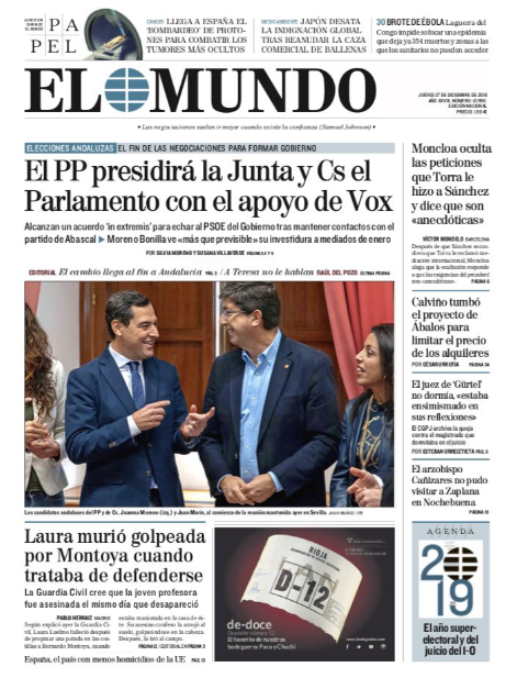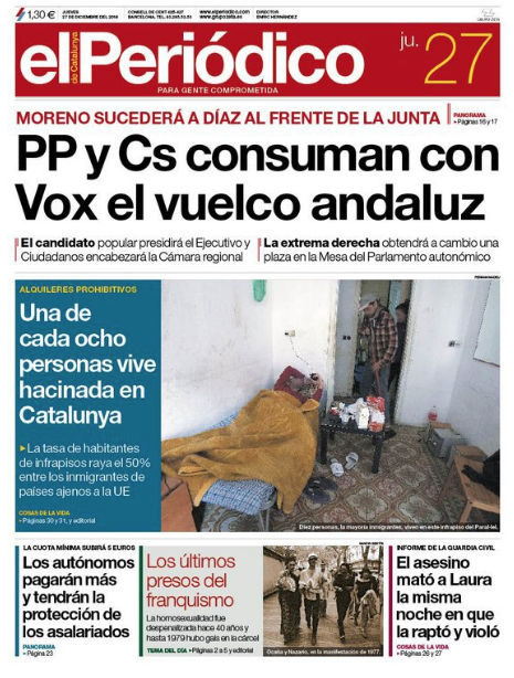 Els titulars dels diaris d’avui són d’una neutralitat i una fredor desconcertants. S’agafen l’acord entre el PP i Ciutadans amb la ultradreta de Vox amb una naturalitat d’allò més. Fins i tot diaris com El Periódico o El País. Potser els lectors d’altres capçaleres no se sorprendran tant, perquè els havien preparat amb cròniques anestèsiques tipus “PP i Cs tanquen el seu acord programàtic a Andalusia amb 90 mesures sense gestos de complicitat a Vox” (El Mundo), o “Vox i Podem tenen en comú un 20% dels seus programes” (La Razón). Com volent dir els uns que PP i Cs fan com Angela Merkel, que ni es planteja el més mínim contacte amb Alternativa per Alemanya, o els altres que tan tòxic és associar-se a Vox com a Podem.