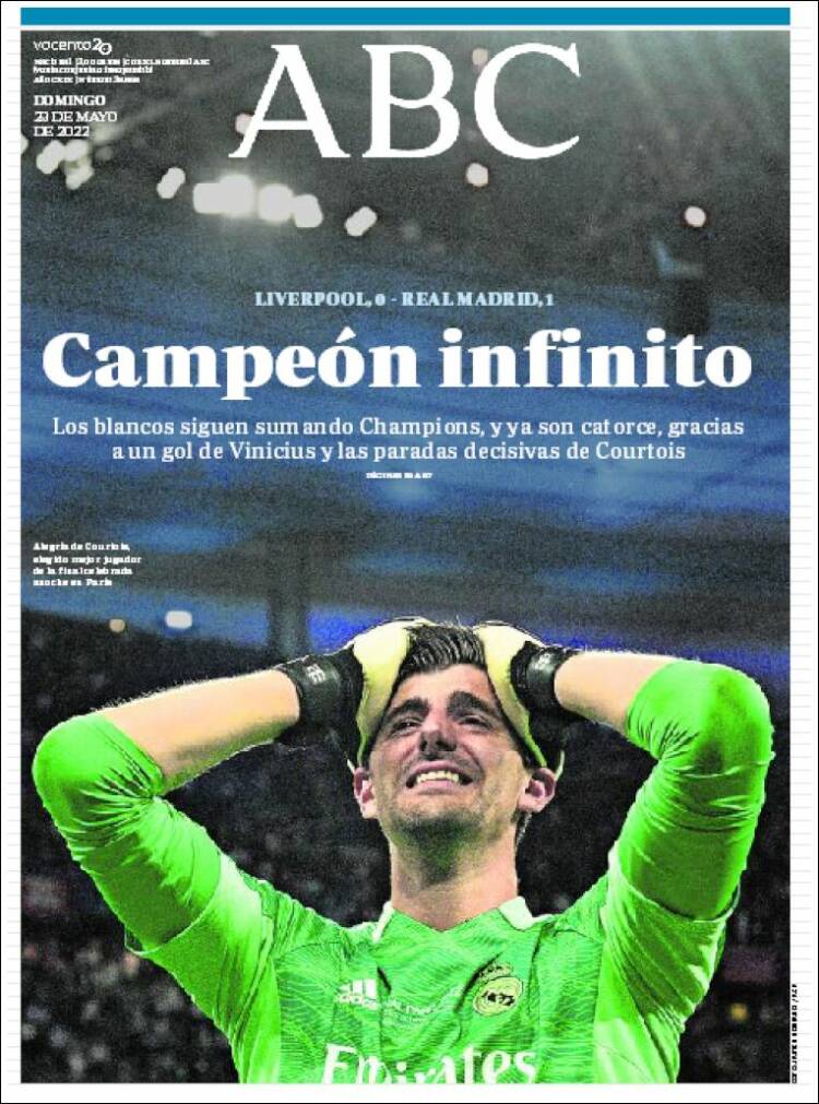 I, finalment, a les rotatives de Madrid no hi ha gaire sorpresa. El Reial Madrid acapara les fotografies d'obertura i els principals titulars: "El Reial Madrid 'augmenta' el seu mite amb un any inoblidable", diu El País; El Mundo es rendeix als blancs amb un "Madrid etern"; l'ABC també aprofundeix en aquesta idea de la dimensió desconeguda amb el títol "Campió infinit" i La Razón opta per "La llegenda guanya la catorzena". Val a dir que La Vanguardia dedica la imatge principal de la seva edició a la nova consecució dels madridistes i utilitza la paraula "conquesta".