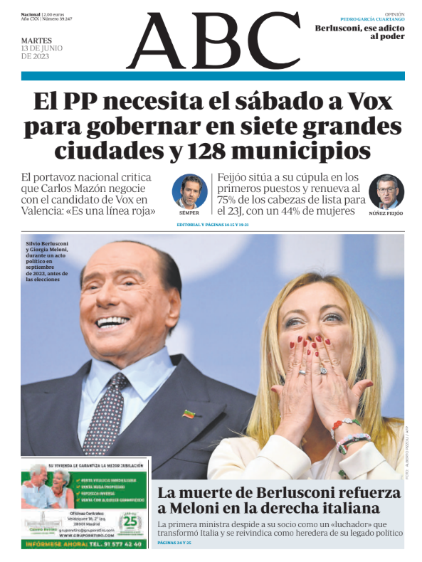 Berlusconi també tindria consells per a Alberto Núñez Feijóo, president del Partit Popular. Abans de dissabte 17 ha de negociar amb Vox les alcaldies de 135 ciutats, entre altres València, Saragossa, Sevilla i Valladolid. Aquest és el tema que inquieta a les portades dels diaris de Madrid. El País ja ho dona per fet —pactaran la dreta extrema i l’extrema dreta— mentre que els diaris del Trio de la Benzina esgoten l’emoció fins a l’últim minut, com fa l’ABC, o potser volen espantar el PP amb el fantasma d’una repetició electoral si no arriba a acords amb els ultres, com fa El Mundo. Berlusconi no va tenir fàstic dels ultres d’Alleanza Nazionale ni als xenòfobs de la Lega Nord. És així com va arribar a ser nou anys president del Consell de Ministres d’Itàlia. Si és veritat el que explica El País —que el PP ja s’ha decidit a anar de bracet amb Vox— ens esperen grans emocions a les portades, l’espai on es presentarà el relat que justifiqui els pactes que seran la llenya pel foc de la campanya de les generals del 23 de juliol. Necessitaran fer aparèixer el Berlusconi dins seu.